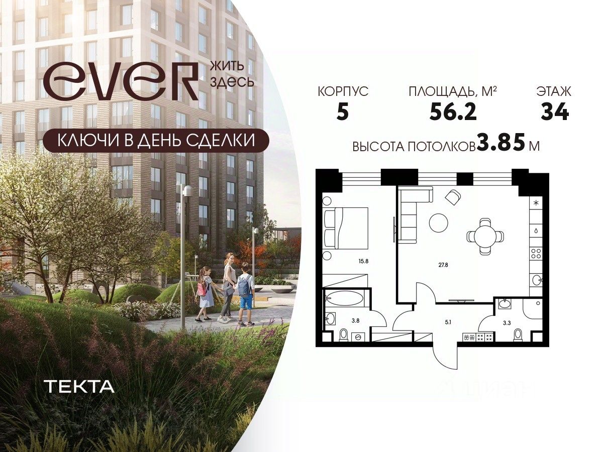 2-комн. квартира в ЖК "Ever" на 34 этаже в 34 этажном здании Корпус 5. Общая площадь: 56.2 кв.м., жилая: 35.2 кв.м. Высота потолков 3.85 м.