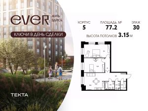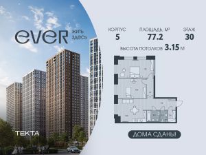 3-комн. квартира в ЖК "Ever" на 30 этаже в 34 этажном здании Корпус 5. Общая площадь: 77.2 кв.м., жилая: 48.0 кв.м. Высота потолков 3.15 м.