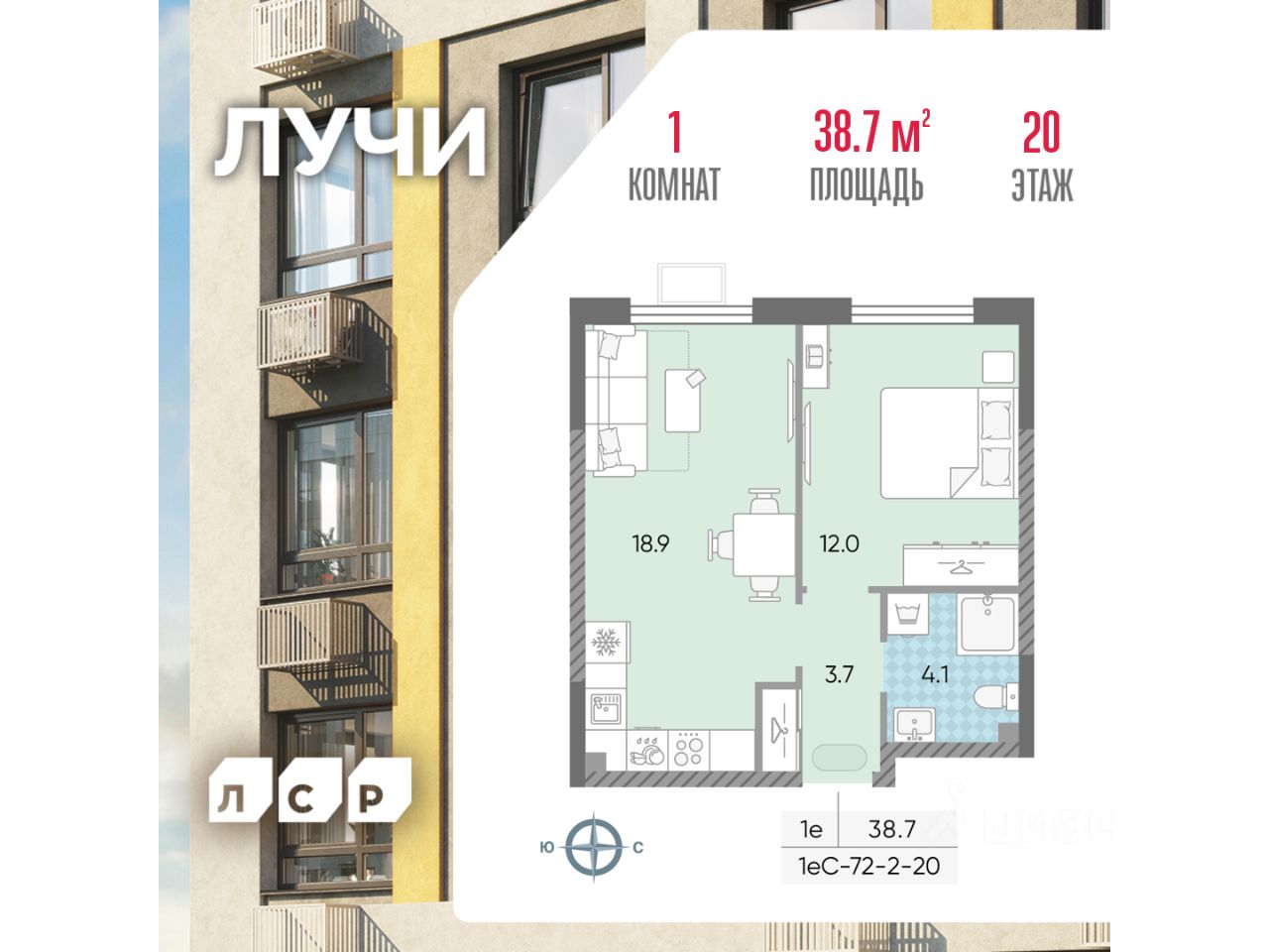 Продается 1-комнатная квартира общей площадью 38.7 кв. метров на 20 этаже жилого комплекса Лучи.