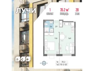 Продается 1-комнатная квартира общей площадью 35.2 кв. метров на 20 этаже жилого комплекса Лучи.