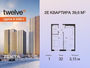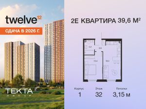 2-комн. квартира в ЖК "Твелв" на 32 этаже в 34 этажном здании Корпус 1. Общая площадь: 39.6 кв.м., жилая: 23.80 кв.м. Высота потолков 3.15 м.