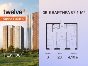 3-комн. квартира в ЖК "Твелв" на 28 этаже в 28 этажном здании Корпус 3. Общая площадь: 67.1 кв.м., жилая: 42.60 кв.м. Высота потолков 4.10 м.