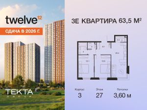 3-комн. квартира в ЖК "Твелв" на 27 этаже в 28 этажном здании Корпус 3. Общая площадь: 63.5 кв.м., жилая: 37.90 кв.м. Высота потолков 3.60 м.