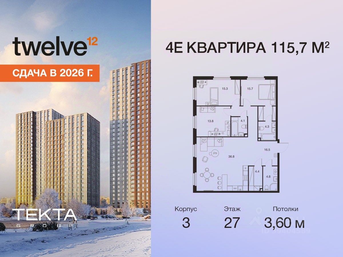 4-комн. квартира в ЖК "Twelve" на 27 этаже в 28 этажном здании Корпус 3. Общая площадь: 115.7 кв.м., жилая: 75.20 кв.м. Высота потолков 3.60 м.