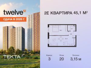 2-комн. квартира в ЖК "Твелв" на 20 этаже в 28 этажном здании Корпус 3. Общая площадь: 45.1 кв.м., жилая: 26.90 кв.м. Высота потолков 3.15 м.