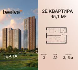 2-комн. квартира в ЖК "Twelve" на 22 этаже в 28 этажном здании Корпус 3. Общая площадь: 45.1 кв.м., жилая: 26.90 кв.м. Высота потолков 3.15 м.