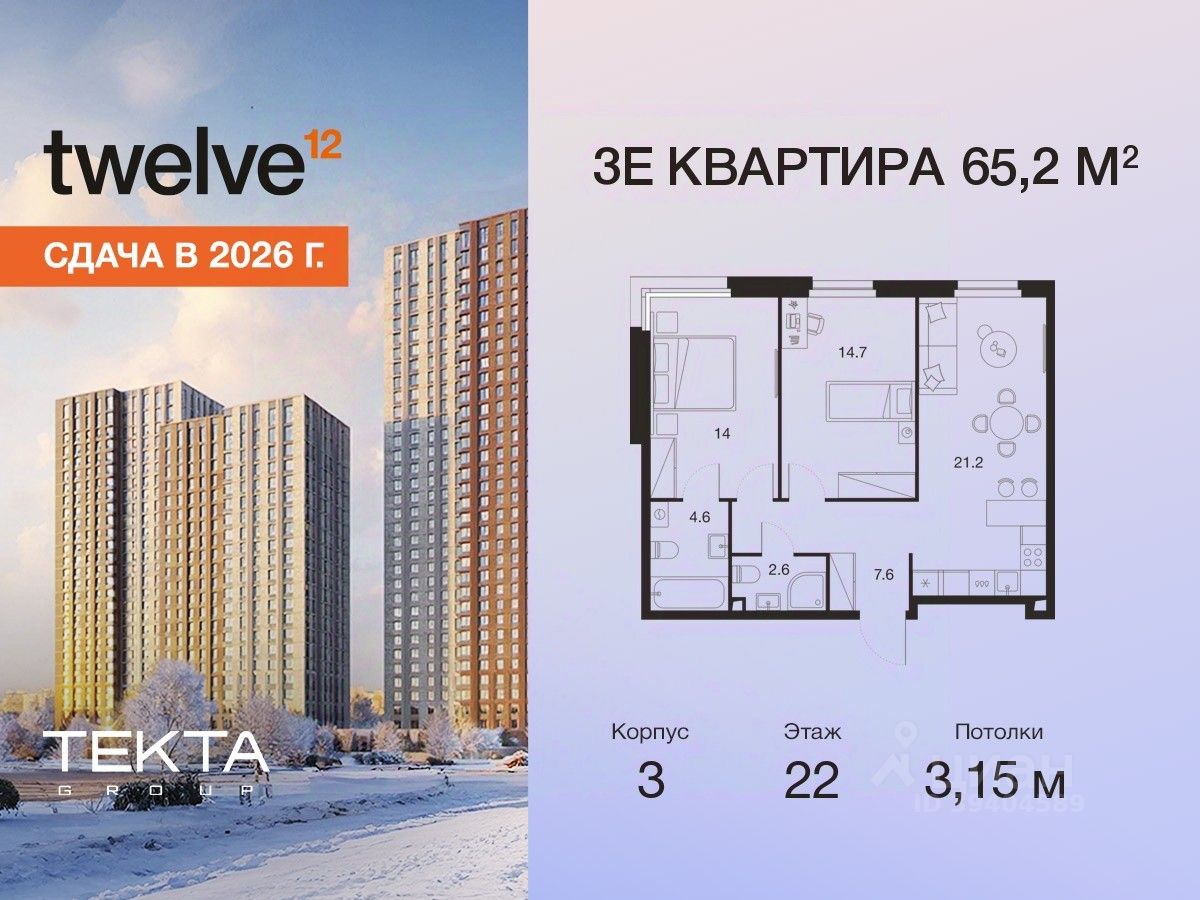 3-комн. квартира в ЖК "Twelve" на 22 этаже в 28 этажном здании Корпус 3. Общая площадь: 65.2 кв.м., жилая: 42.70 кв.м. Высота потолков 3.15 м.