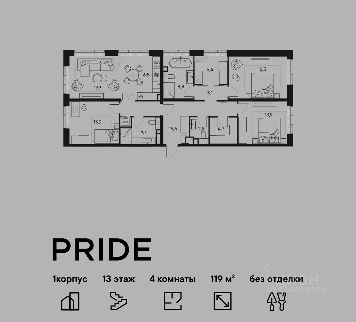 В премиальном жилом квартале PRIDE продается 4-комнатная квартира в 1 корпусе, на 13 этаже, в секции 3. Её общая площадь составляет 119 м². Пространство включает 3 уютные спальни 13,9 м², 13,9 м², 16,3 м², просторную кухню-гостиную 26,5 м² и 2 ванные комнаты 5,7 м² и 8,8 м². Ключи в 2026 году.