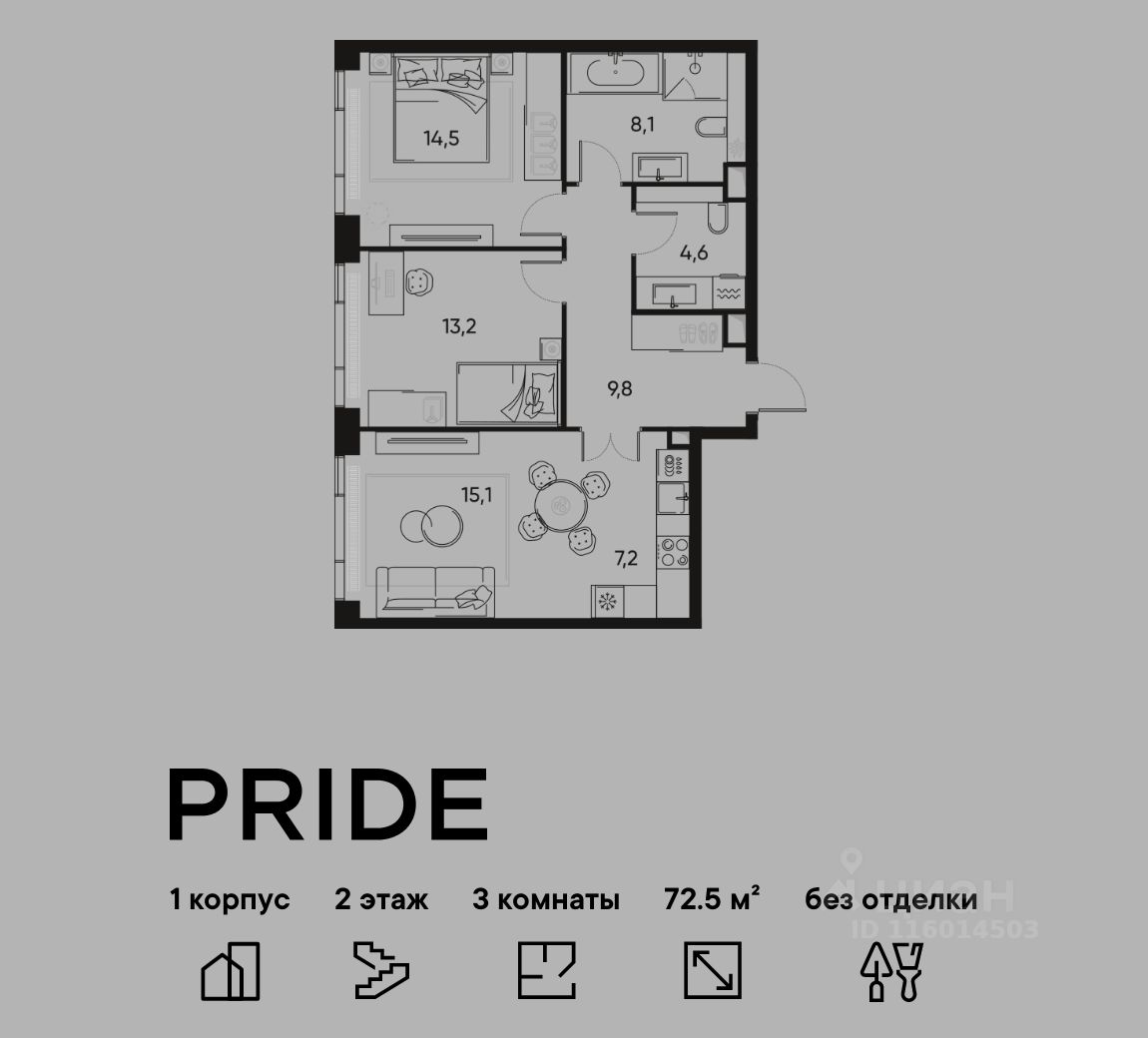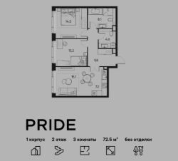 В премиальном жилом квартале PRIDE продается 3-комнатная квартира в 1 корпусе, на 2 этаже, в секции 4. Её общая площадь составляет 72.5 м². Пространство включает 2 уютные спальни 13,2 м², 14,5 м², просторную кухню-гостиную 22,2 м² и 2 ванные комнаты 8,1 м² и 4,6 м². Ключи в 2026 году.