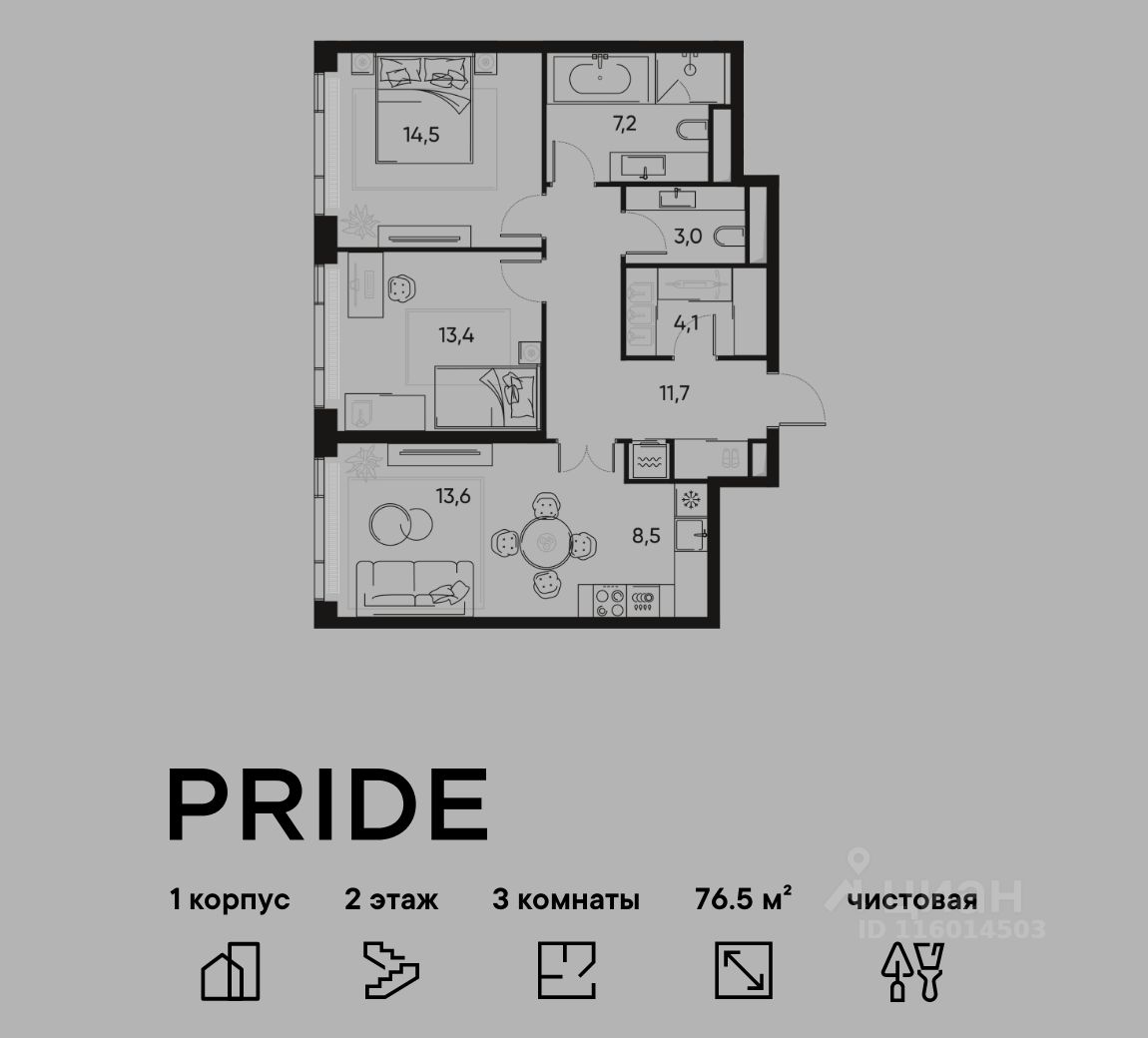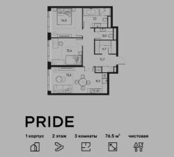 В премиальном жилом квартале PRIDE продается 3-комнатная квартира в 1 корпусе, на 2 этаже, в секции 8. Её общая площадь составляет 76.5 м². Пространство включает 2 уютные спальни 13,4 м², 14,5 м², просторную кухню-гостиную 22 м² и ванную комнату 7,2 м². В квартире будет выполнена дизайнерская отделка, представленная двумя стилистическими решениями на выбор. Ключи в 2026 году.