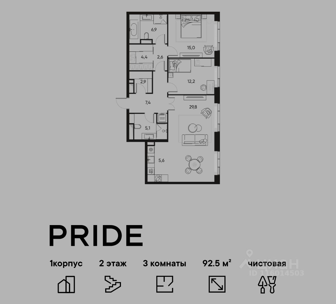 В премиальном жилом квартале PRIDE продается 3-комнатная квартира в 1 корпусе, на 2 этаже, в секции 9. Её общая площадь составляет 92.5 м². Пространство включает 2 уютные спальни 12,2 м², 15 м², просторную кухню-гостиную 35,4 м² и 2 ванные комнаты 6,9 м² и 5,1 м². В квартире будет выполнена дизайнерская отделка, представленная двумя стилистическими решениями на выбор. Ключи в 2026 году.