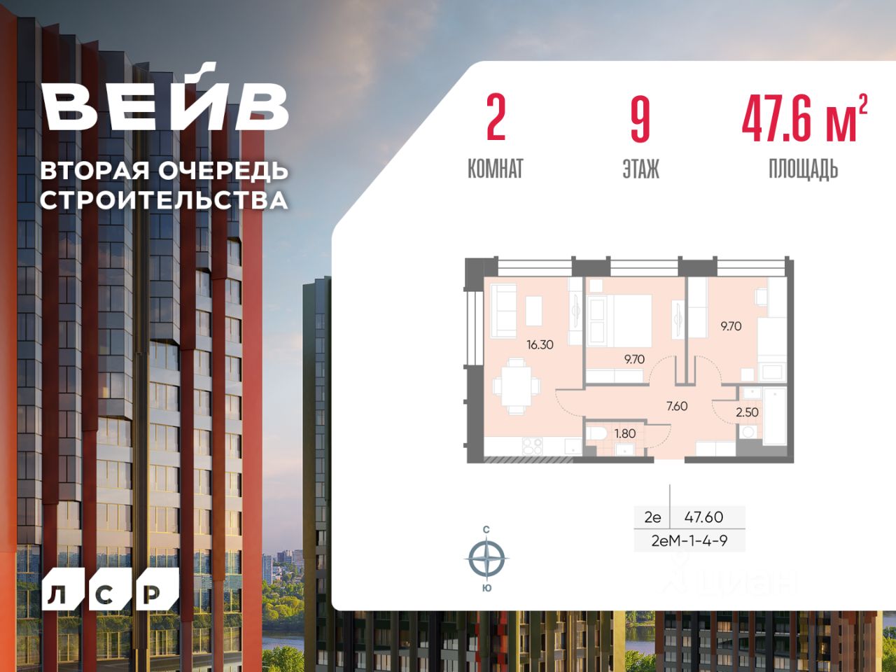 Продается 2-комнатная квартира общей площадью 47.6 кв. метров на 9 этаже жилого комплекса ВЕЙВ. Комплекс располагается на юге Москвы в районе Москворечье-Сабурово. В пешей доступности расположены станция МЦД "Москворечье" и станция метро "Борисово". Для автомобилистов есть удобное сообщение с Каширским шоссе.