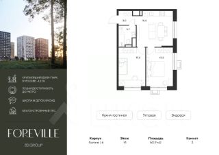 Продается уютная 2-комн. квартира площадью 50,9 кв.м на 14 этаже 17 этажного жилого комплекса бизнес-класса Foreville от 3S Group.