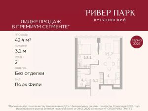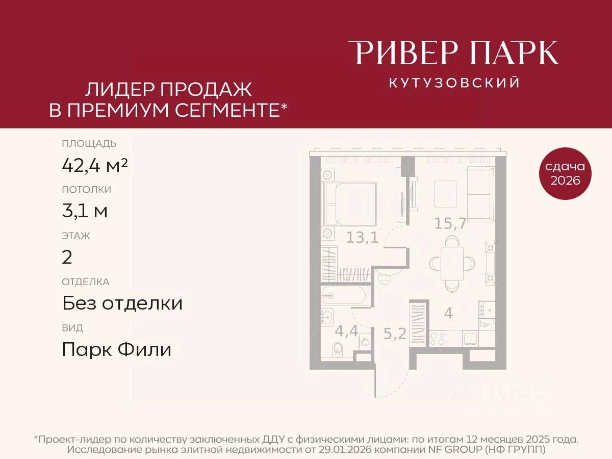 Продается 1-к квартира площадью 42.4 кв.м. на 2-м этаже в жилом комплексе премиум-класса Ривер Парк Кутузовский в Башне Янтарь