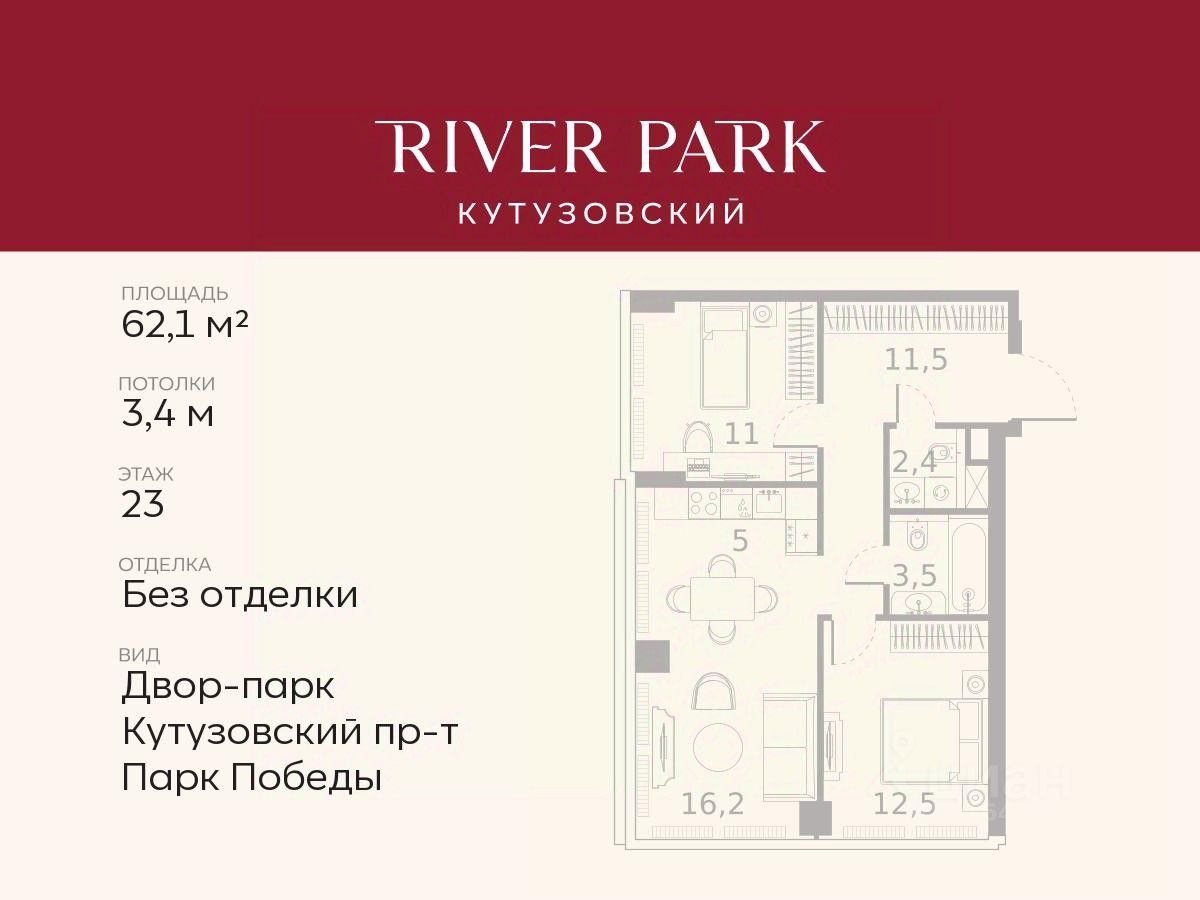 Продается 2-к квартира площадью 62.1 кв.м. на 23-м этаже в жилом комплексе премиум-класса River Park Кутузовский в Башне Amber Tower