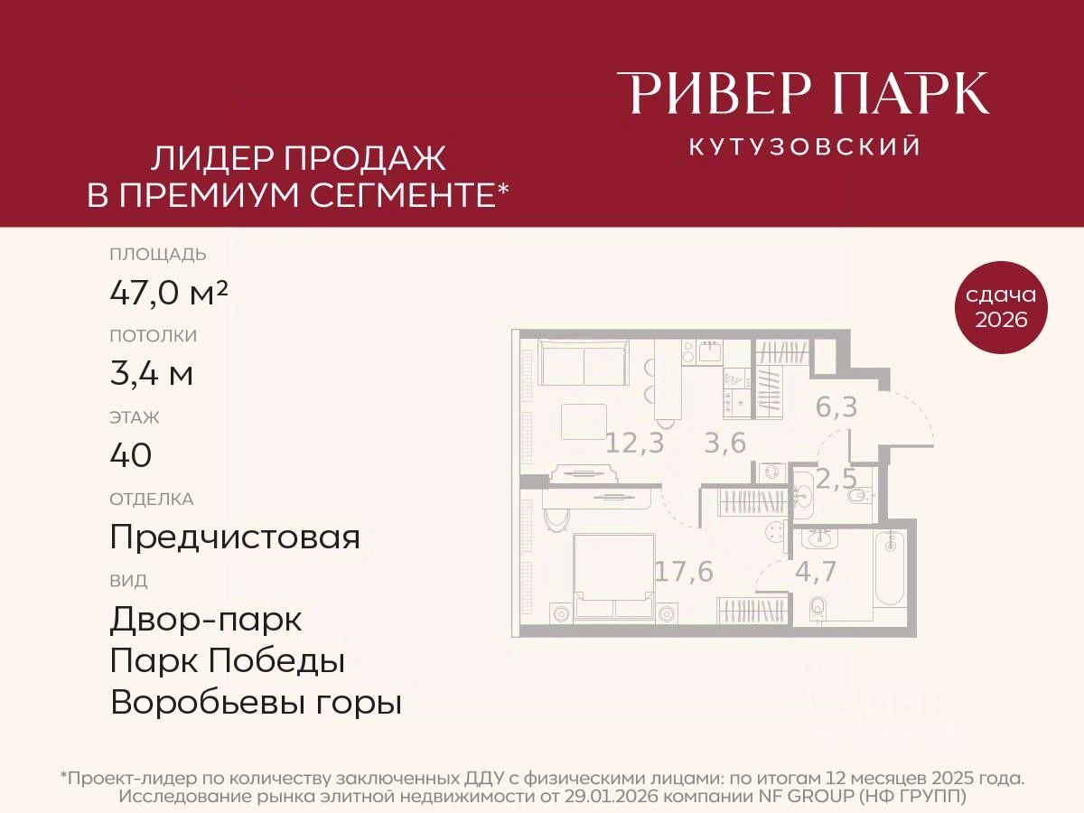Продается 1-к квартира площадью 47.0 кв.м. на 40-м этаже в жилом комплексе премиум-класса Ривер Парк Кутузовский в Башне Изумруд