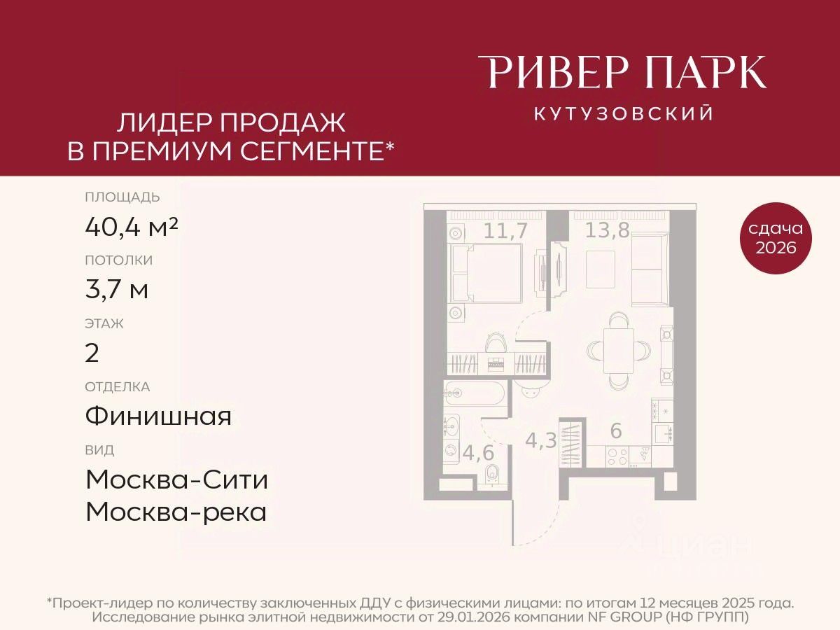 Продается 1-к квартира площадью 40.4 кв.м. на 2-м этаже в жилом комплексе премиум-класса Ривер Парк Кутузовский в Башне Топаз