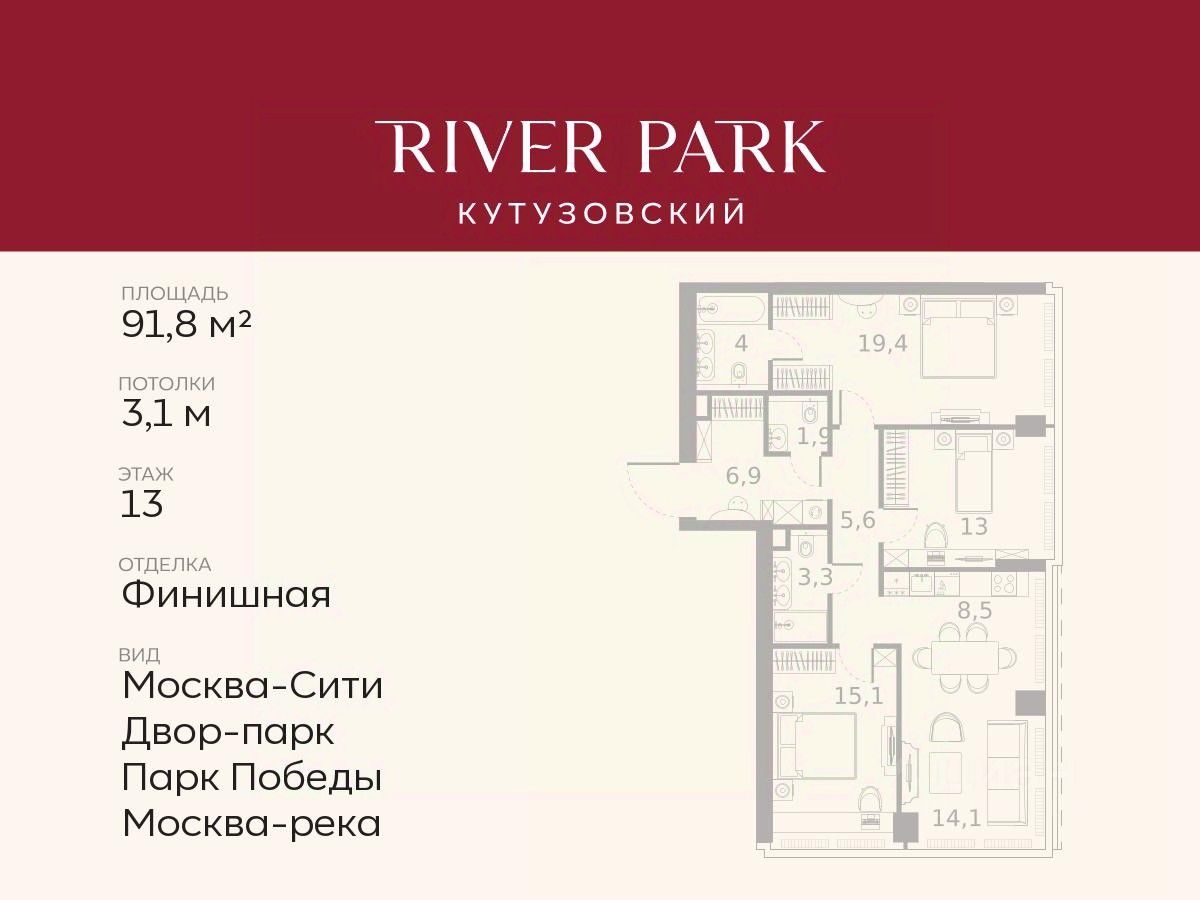 Продается 3-к квартира площадью 91.8 кв.м. на 13-м этаже в жилом комплексе премиум-класса River Park Кутузовский в Башне Topaz Tower