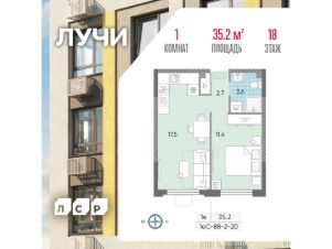 Продается 1-комнатная квартира общей площадью 35.2 кв. метров на 18 этаже жилого комплекса Лучи.