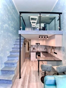 Первый этаж занимает уютная кухня и гостиная, на втором этаже расположена спальня с просторным гардеробом и рабочая зона.