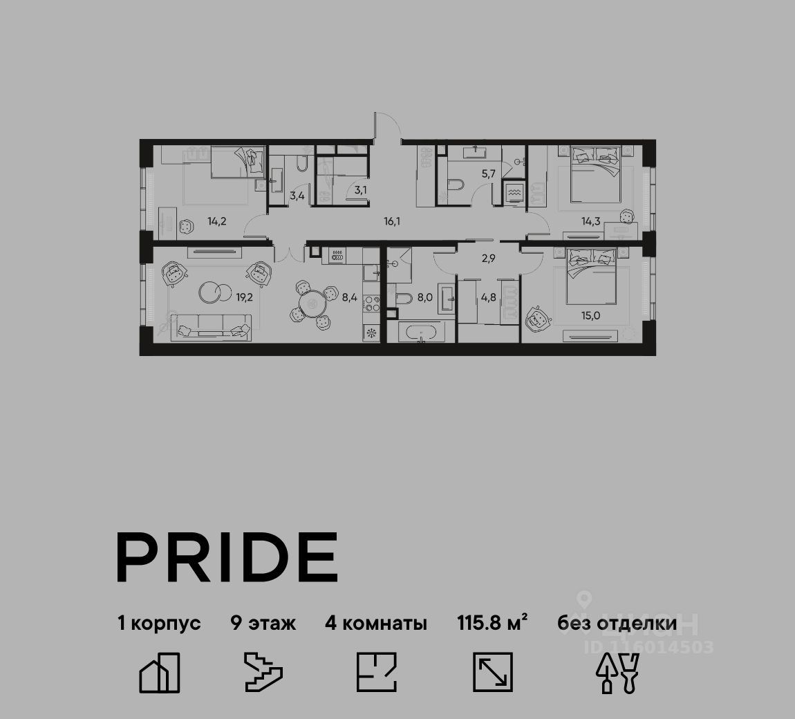 В премиальном жилом квартале PRIDE продается 4-комнатная квартира в 1 корпусе, на 9 этаже, в секции 6. Её общая площадь составляет 115.8 м². Пространство включает 3 уютные спальни 14,2 м², 14,2 м², 15 м², просторную кухню-гостиную 27,5 м² и 2 ванные комнаты 5,7 м² и 8 м². Ключи в 2026 году.