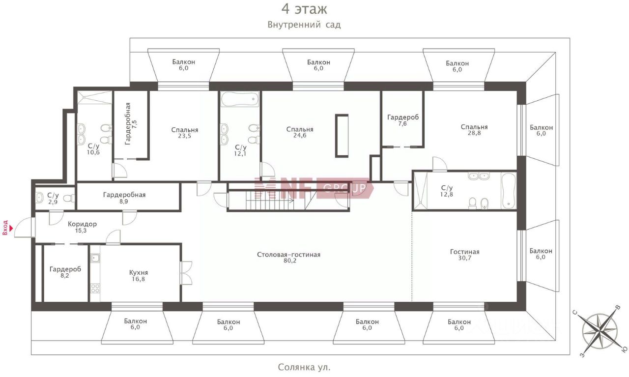 В пентхаусе предусмотрено девять балконов, каждый площадью 6 кв. м, также имеется выход на террасу площадью 159,5 кв.м.