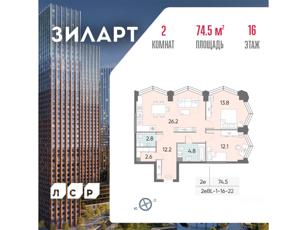 Продаётся 2-комнатная квартира в доме ЗИЛАРТ СПАРК общей площадью 74.5 кв. метров на 16 этаже.