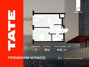Продается 1-комнатная квартира от застройщика в ЖК премиум-класса TATE на 34 этаже. Общая площадь 40,17 м². Отделка предчистовая (white box). 1 санузел. Вид из окна на Тимирязевский парк. Башня A.