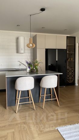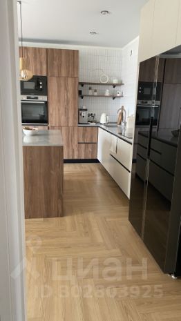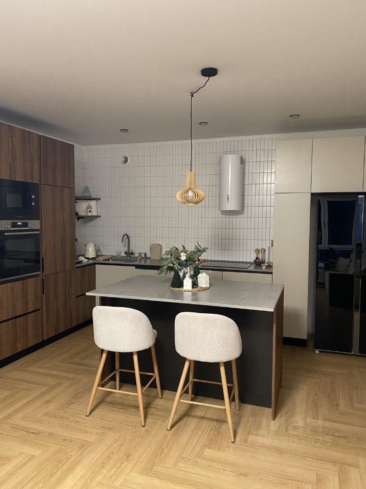 Большая кухня с островом, столешницей из кварцевого агломерата, большим двухкамерным холодильником, посудомоечной машиной 60 см и встроенной индукционной плитой на четыре конфорки. Духовой шкаф и микроволновая печь встроены в пенал. Верхних шкафов нет, что даёт пространству воздух и не утяжеляет его. Фартук выложен во всю стену до потолка мозаикой. Всё хранение помещается в нижних ящиках, пеналах и острове. Места много, поэтому в антресольных шкафах и в одном из пеналов можно хранить личные вещи. Есть винный шкаф. Механизмы Blum, мебель Стильные кухни, техника Bosch и Maunfeld, каменная раковина и кран Omoikiri. Фасады: светлые — МДФ в эмали, тёмные — МДФ под дерево. Мощный кондиционер Hisense, который засчитан на это большое помещение.