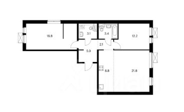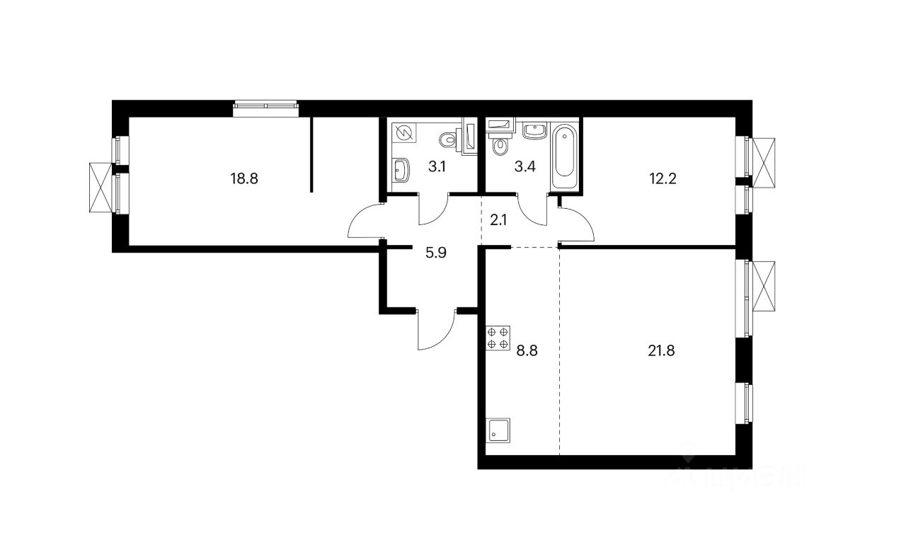 Угловая евротрёшка с кухней-гостиной 30 кв.м и с островом. В квартире две спальни и два санузла, в одном из них постирочная. Одна спальня выходит во двор, на юг, остальные комнаты — на север.
