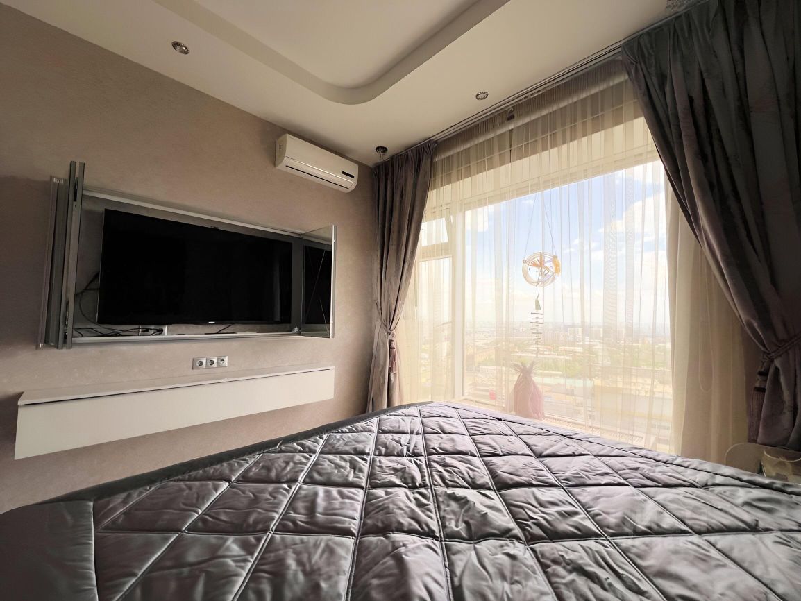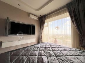 Высокие потолки 3 метра,панорамное остекление.Общая площадь 54.7. Планировочное решение:просторная кухня-гостиная 27.3 метров разделенная стеклянной раздвижной перегородкой,изолированная спальня 16.4 с вместительным угловым шкафом-гардеробной,совмещенный санузел.