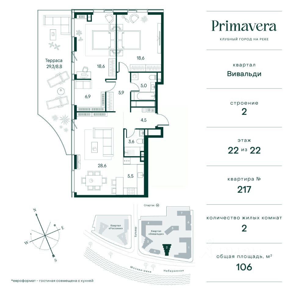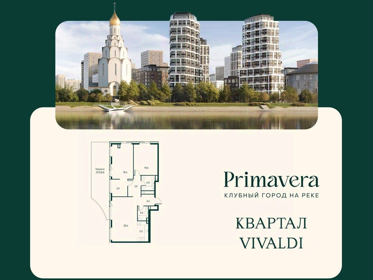 Клубный город на реке Primavera — это респектабельный проект премиум-класса на первой береговой линии Москвы-реки в экологически безупречном районе — Покровское-Стрешнево. Под панорамными окнами квартир расположился собственный экопарк, площадью 12 гектаров с сетью прогулочных дорожек, оборудованный детскими и спортивными площадками, а за ним набережная с собственным пляжем и зонами отдыха. Клубный город на реке Primavera предлагает впечатляющий выбор планировок для любого жизненного сценария: от просторных однокомнатных квартир до пентхаусов и квартир с видовыми террасами или патио. Выбирайте из 120 вариантов эргономичных планировок стандартного и евроформата. В проекте доступны квартиры площадью от 40 до 209 м², в каждой из которых открываются непревзойденные виды на реку, а угол обзора составляет 270 градусов. Из дизайнерских лобби открывается панорамный обзор на зеленый благоустроенный двор. Статусное мебелирование, потолки высотой 6 м и комфортная лаунж-зона отсылают к стилистике высококлассных пятизвездочных отелей. В Primavera есть все, что может предложить мегаполис, здесь все сосредоточено вокруг вас и настроено на ваши желания: - Всестороннее детское развитие в паре шагов от дома: 4 школы, 8 детских садов, развивающие центры с кружками и секциями. - Комфорт мегаполиса на расстоянии приятной прогулки: супермаркеты, кафе, рестораны с верандами на крыше, салоны красоты, аптеки, компании сферы услуг, многофункциональный центр для шоппинга и развлечений. - Умный дом: автоматизированное бесконтактное управление основными системами доступа, инфраструктуры и безопасности через мобильное приложение и специальные метки. Клубный город на реке Primavera выгодно отличается близостью к природе, совмещенной с насыщенной инфраструктурой.