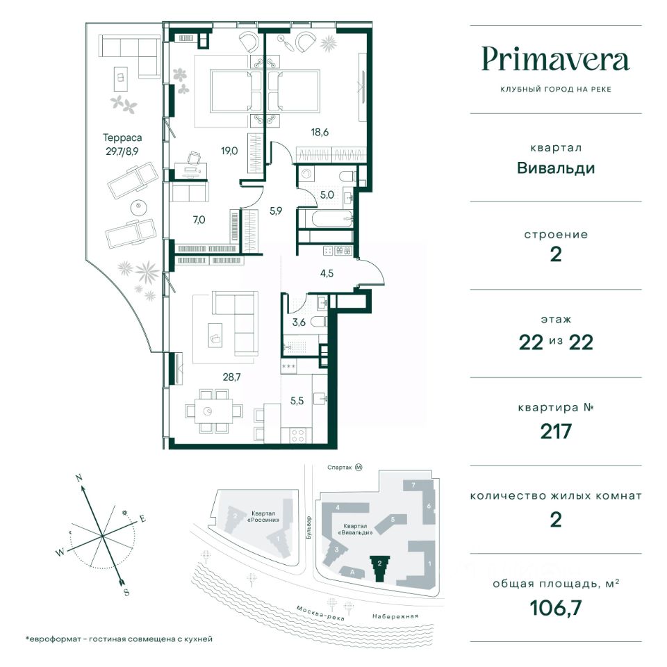 Клубный город на реке Primavera — это современный жилой комплекс премиум-класса, расположенный на первой береговой линии Москвы-реки в экологически чистом районе Покровское-Стрешнево. Под панорамными окнами квартир находится собственный экопарк с продуманной сетью прогулочных дорожек и современными детскими и спортивными площадками. За парком расположена набережная с собственным пляжем и зонами для отдыха. Клубный город на реке Primavera предлагает широкий выбор планировок для различных жизненных сценариев: от просторных однокомнатных квартир до пентхаусов и жилых помещений с террасами и патио. Выберите из 120 вариантов эргономичных планировок стандартного и евроформата. Из каждой квартиры открываются красивые виды на реку с углом обзора в 270 градусов. Дизайнерские лобби предлагают панорамный обзор на благоустроенный двор. Высокие потолки в 6 метров и качественная отделка создают атмосферу, схожую с пятизвездочными отелями. В Primavera есть всё необходимое для комфортной жизни в мегаполисе: • Образование для детей в шаговой доступности: 4 школы, 8 детских садов и развивающие центры с кружками и секциями. • Удобства на расстоянии приятной прогулки: супермаркеты, кафе, рестораны с верандами, салоны красоты, аптеки и многофункциональный центр для шоппинга и развлечений. • Умный дом: автоматизированное бесконтактное управление основными системами доступа и безопасности через мобильное приложение. Клубный город на реке Primavera выгодно сочетает комфорт городской жизни с близостью к природе. Живите в месте, где все создано для вашего удобства!