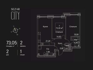 Продается 2-комнатная квартира в ЖК SEZAR CITY на 2 этаже. Общая площадь квартиры составляет 73,05 кв.м. Квартира без отделки. Срок сдачи - 2027 год.