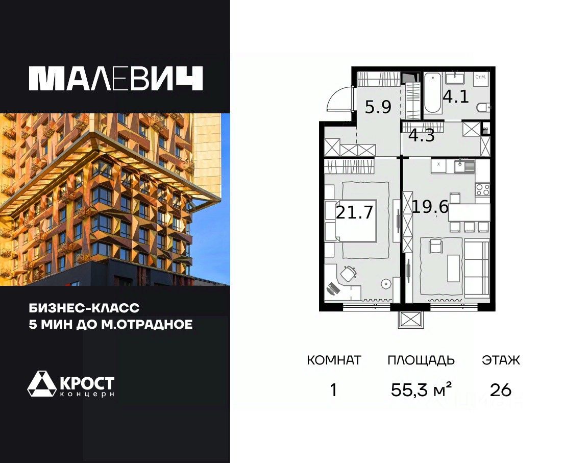 Продаётся 1-к квартира 55.3 кв.м. на 26-м этаже 28 этажного дома.