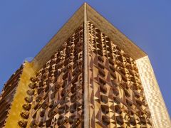 Здание состоит из двух объемов, один из которых сдвинут относительного другого в горизонтальной плоскости.