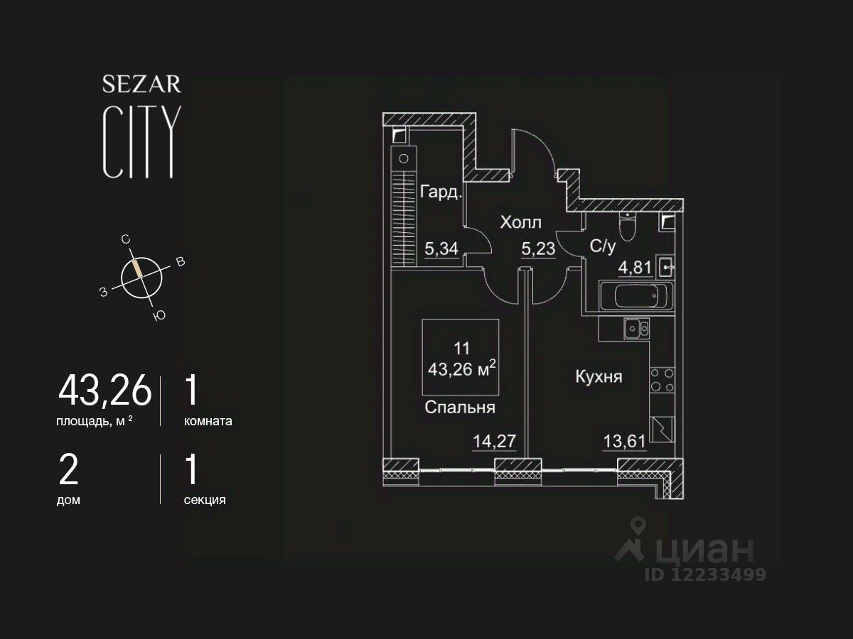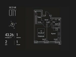 Продается 1-комнатная квартира в ЖК SEZAR CITY на 2 этаже. Общая площадь квартиры составляет 43,26 кв.м. Квартира без отделки. Срок сдачи - 2027 год.