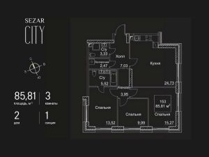 Продается 3-комнатная квартира в ЖК SEZAR CITY на 15 этаже. Общая площадь квартиры составляет 85,81 кв.м. Квартира без отделки. Срок сдачи - 2027 год.