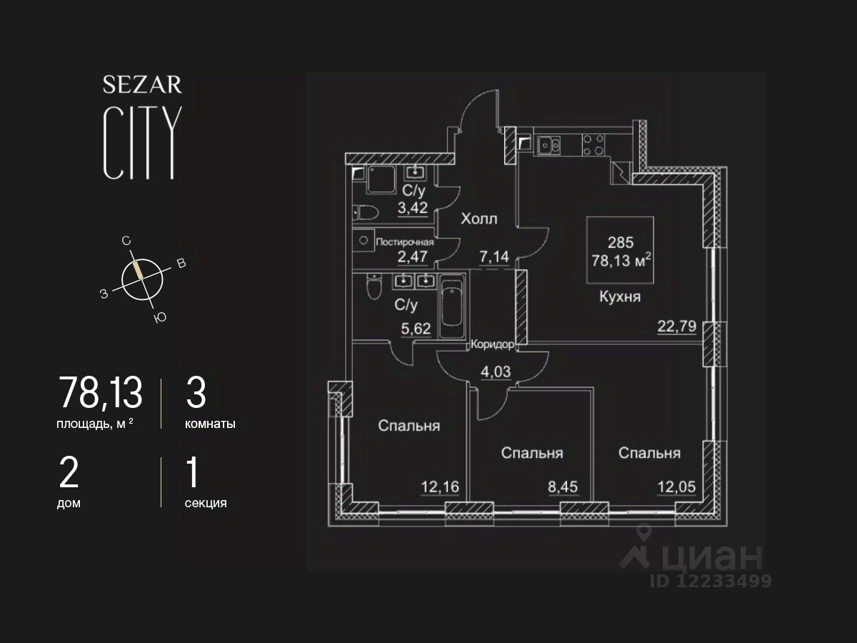 Продается 3-комнатная квартира в ЖК SEZAR CITY на 28 этаже. Общая площадь квартиры составляет 78,13 кв.м. Квартира без отделки. Срок сдачи - 2027 год.