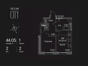 Продается 1-комнатная квартира в ЖК SEZAR CITY на 2 этаже. Общая площадь квартиры составляет 44,05 кв.м. Квартира без отделки. Срок сдачи - 2027 год.
