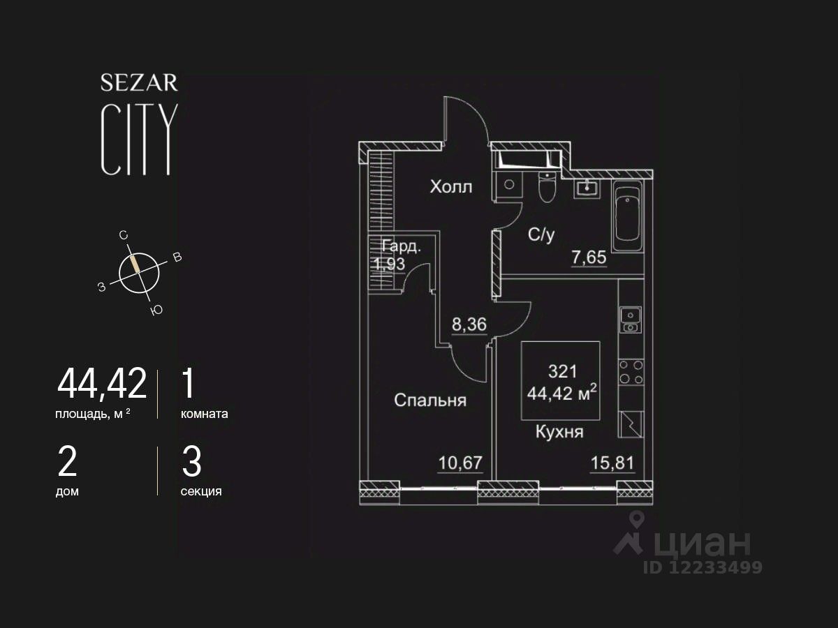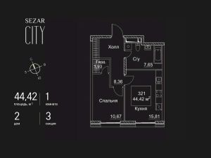 Продается 1-комнатная квартира в ЖК SEZAR CITY на 2 этаже. Общая площадь квартиры составляет 44,42 кв.м. Квартира без отделки. Срок сдачи - 2027 год.