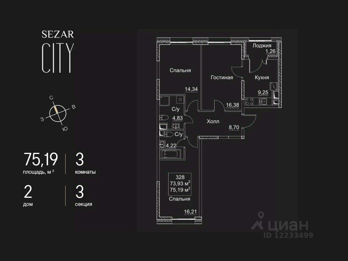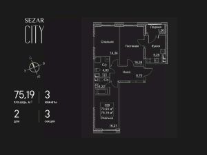 Продается 3-комнатная квартира в ЖК SEZAR CITY на 3 этаже. Общая площадь квартиры составляет 75,19 кв.м. Квартира без отделки. Срок сдачи - 2027 год.
