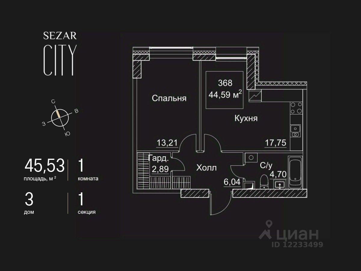 Продается 1-комнатная квартира в ЖК SEZAR CITY на 35 этаже. Общая площадь квартиры составляет 45,53 кв.м. Квартира без отделки. Срок сдачи — 2027 год.