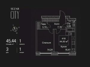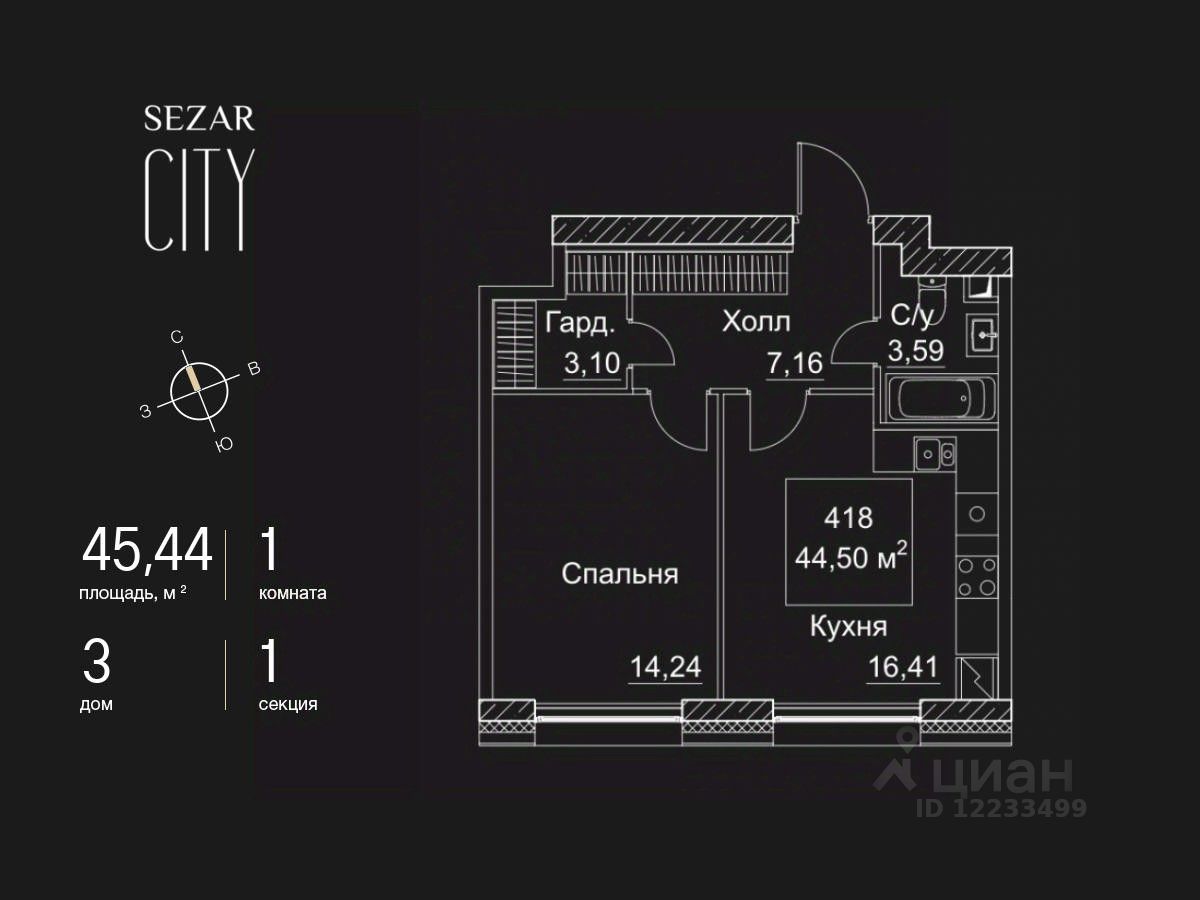 Продается 1-комнатная квартира в ЖК SEZAR CITY на 39 этаже. Общая площадь квартиры составляет 45,44 кв.м. Квартира без отделки. Срок сдачи - 2027 год.