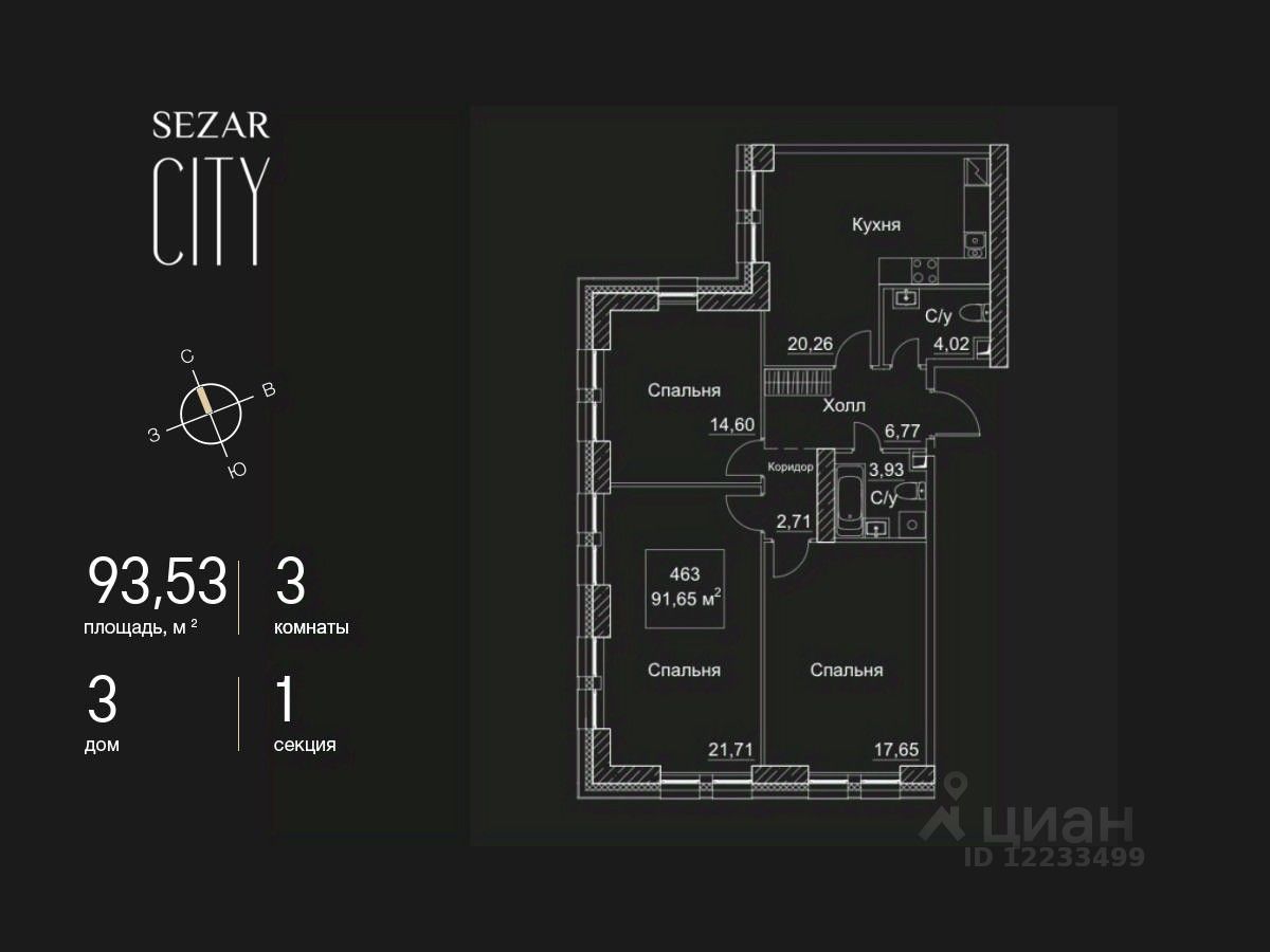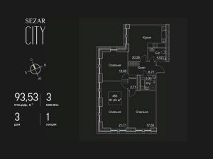 Продается 3-комнатная квартира в ЖК SEZAR CITY на 44 этаже. Общая площадь квартиры составляет 93,53 кв.м. Квартира без отделки. Срок сдачи - 2027 год.