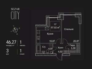 Продается 1-комнатная квартира в ЖК SEZAR CITY на 3 этаже. Общая площадь квартиры составляет 46,27 кв.м. Квартира без отделки. Срок сдачи - 2027 год.
