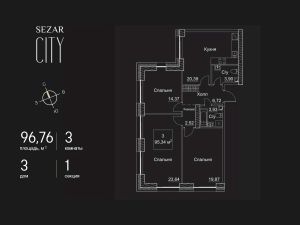 Продается 3-комнатная квартира в ЖК SEZAR CITY на 2 этаже. Общая площадь квартиры составляет 96,76 кв.м. Квартира без отделки. Срок сдачи — 2027 год.