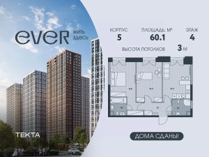 3-комн. квартира в ЖК "Ever" на 4 этаже в 34 этажном здании Корпус 5. Общая площадь: 60.1 кв.м., жилая: 41.9 кв.м. Высота потолков 3.00 м.