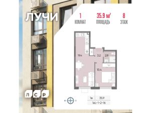 Продается 1-комнатная квартира общей площадью 35.9 кв. метров на 8 этаже жилого комплекса Лучи.