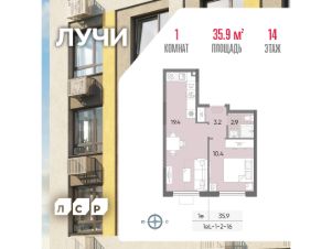 Продается 1-комнатная квартира общей площадью 35.9 кв. метров на 14 этаже жилого комплекса Лучи.